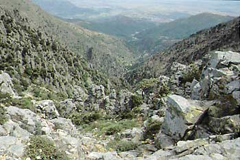 Linas. Il canalone aspro di Zairi visto da Genn' 'e Impi, nello sfondo il rio Piras e Gonnosfanadiga.