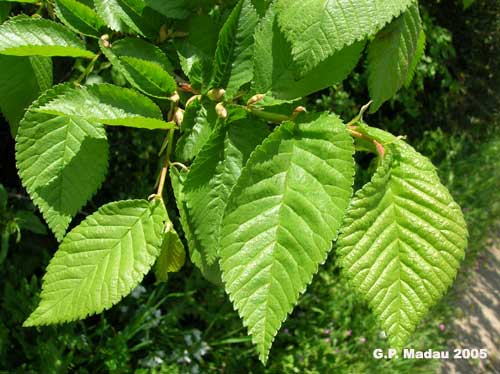 Caduche, con base asimmetriche, obovato-acute, alterne, brevemente picciuolate, doppiamente seghettate con apice appuntite; di colore verde-scuro lucido e glabra nella pagina superiore, e piů chiara in quella inferiore.