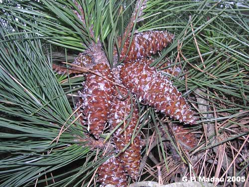 Pigne lunghe fino a 22 cm, in gruppi fino a 5, ovate e appuntite, di colore bruno lucido e resinose. Le pigne, una volta mature, restano sull’albero per diversi anni. Seme molto piccolo e alato.