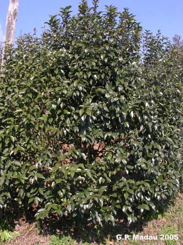 Arbusto o alberello alto fino a 8-10 metri, chioma arrotondata di colore verde scuro, con fusto breve.